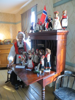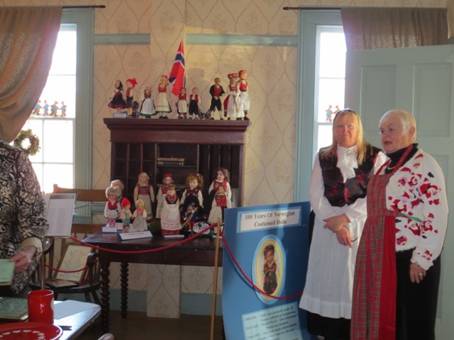 Lynda Thayer and Delores Lorenz admiring Norwegian dolls and decor in the dining room |