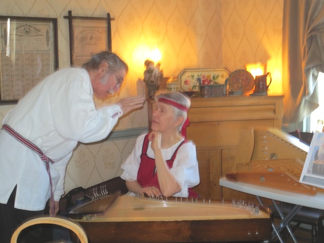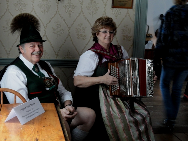 Peg and Hans Mueller, wearing authentic Bavarian Trach, entertain visitors while playing the button box accordian and the wooden spoons. |