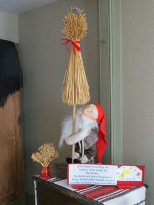 Tonttu, elves considered guardians of dwellings and farms, offer wheat to the birds |