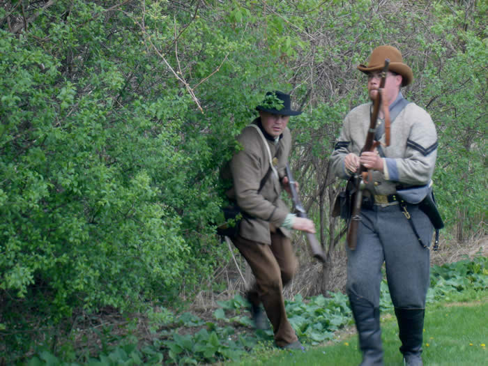 | Confederate troops come out from hiding in the underbrush. |